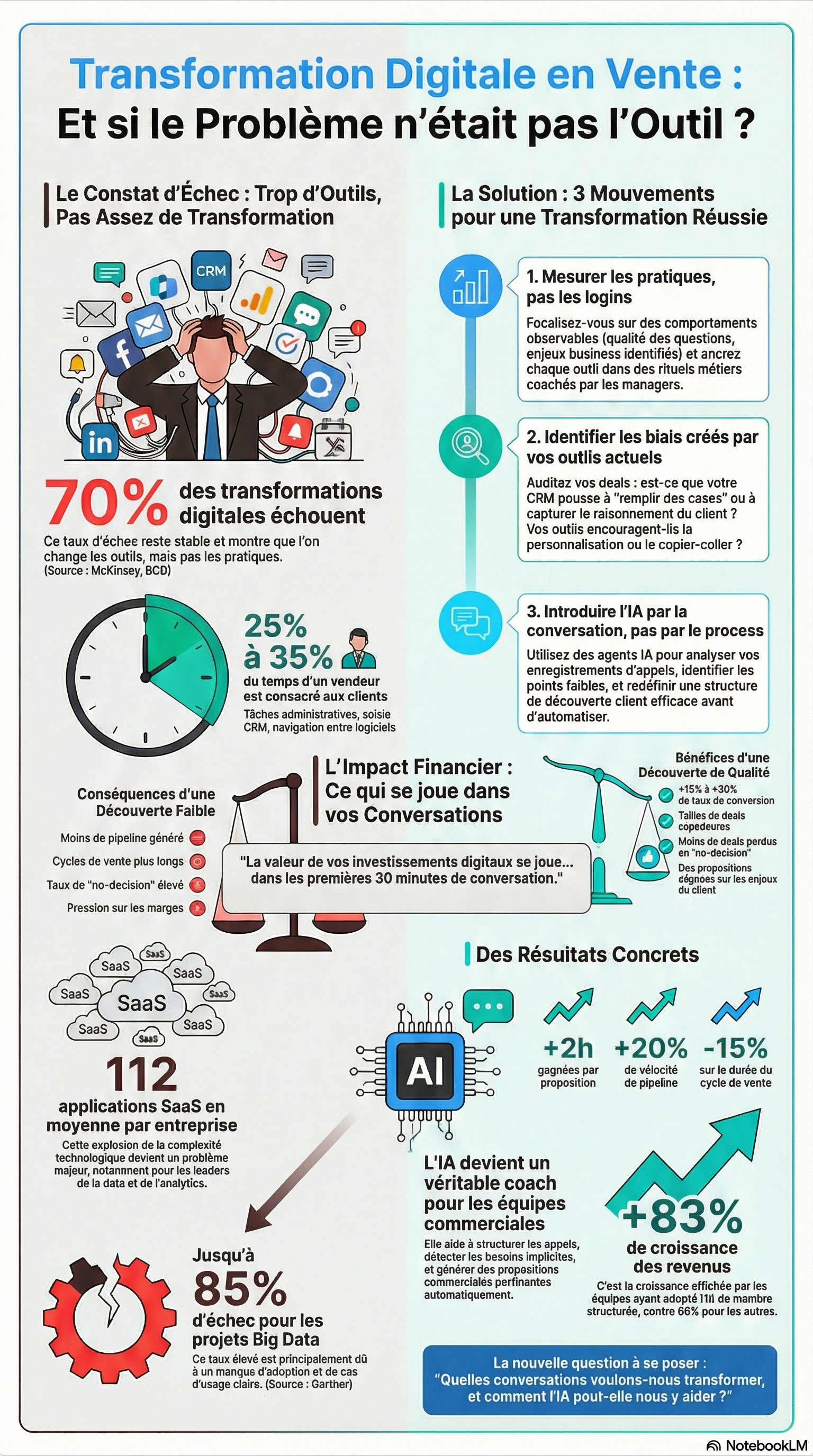 L'argument central est simple : la valeur se crée dans les premières minutes de la conversation. Les plateformes d'intelligence conversationnelle montrent qu'une phase de découverte riche est systématiquement corrélée aux deals gagnés. Une bonne découverte est associée à +15 % à +30 % de taux de win et à des tailles de deals supérieures, car plusieurs enjeux et lignes de valeur sont identifiés. La performance de vos investissements digitaux se joue ici, bien plus que dans la dizaine d'outils que vous empilez.