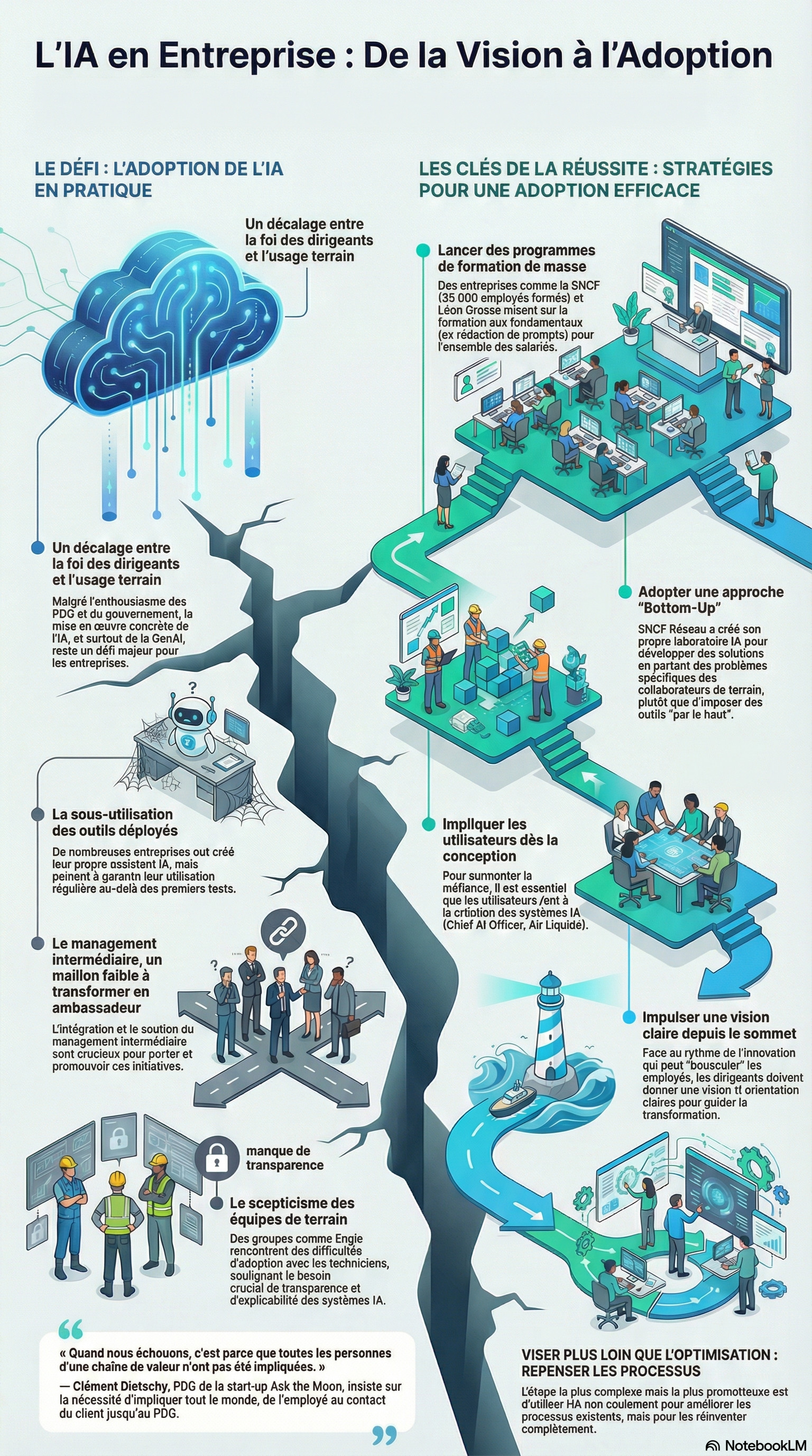 Cette transformation exige une vision claire portée par la direction. Comme le souligne Sébastien Arbola d'Engie, face à des collaborateurs "bousculés par le rythme de l'innovation", il incombe aux dirigeants d'impulser une direction qui oriente et rassure.