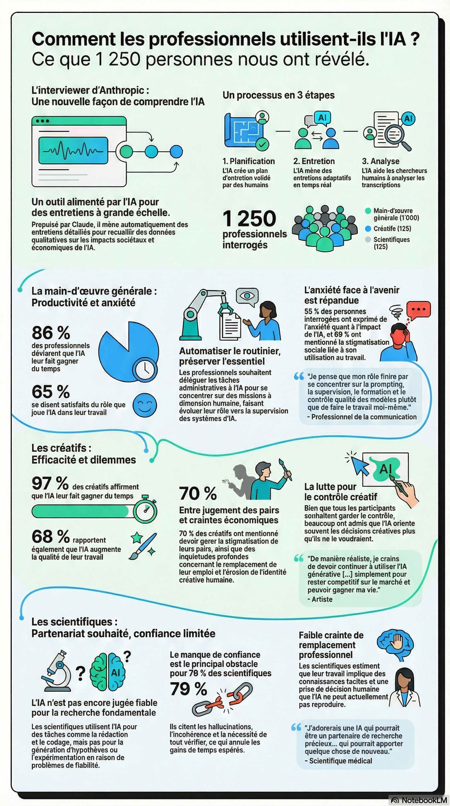 Ce résumé explore les découvertes de l'étude pour trois groupes distincts — le personnel général, les créatifs et les scientifiques — afin de comprendre comment l'IA transforme concrètement leur travail. Les résultats révèlent une diversité d'expériences, mêlant optimisme, gains de productivité, mais aussi anxiété et défis uniques à chaque profession.