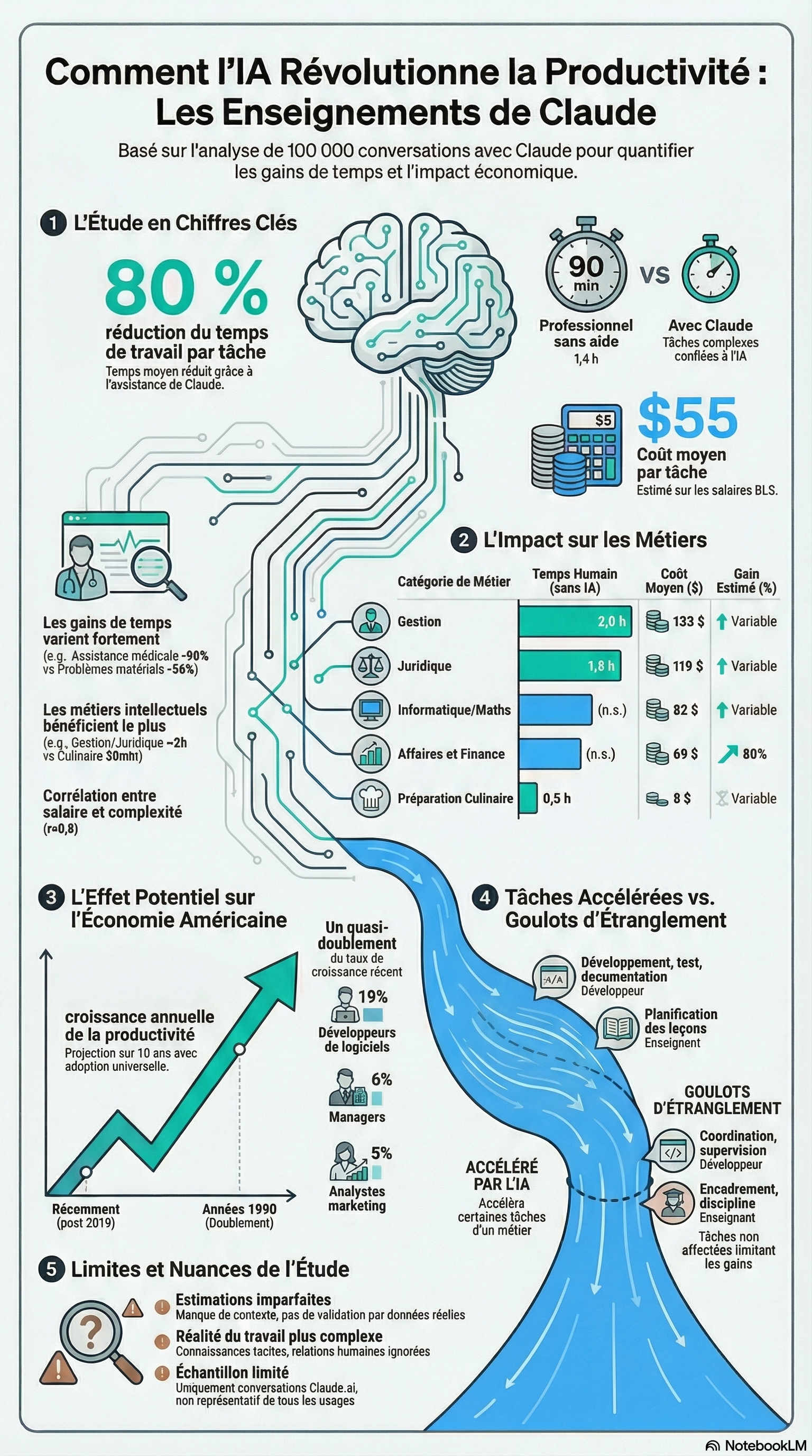 Le résultat le plus frappant de l'étude est sans équivoque. Sur l'ensemble des 100 000 conversations analysées, selon les estimations de Claude lui-même, l'IA a réduit le temps nécessaire pour accomplir une tâche de 80 % en moyenne. Il est crucial de noter, comme le soulignent les chercheurs eux-mêmes, que cette estimation ne prend pas en compte le temps que les professionnels passent en dehors de leur conversation avec l'IA, notamment pour vérifier ou affiner les résultats.