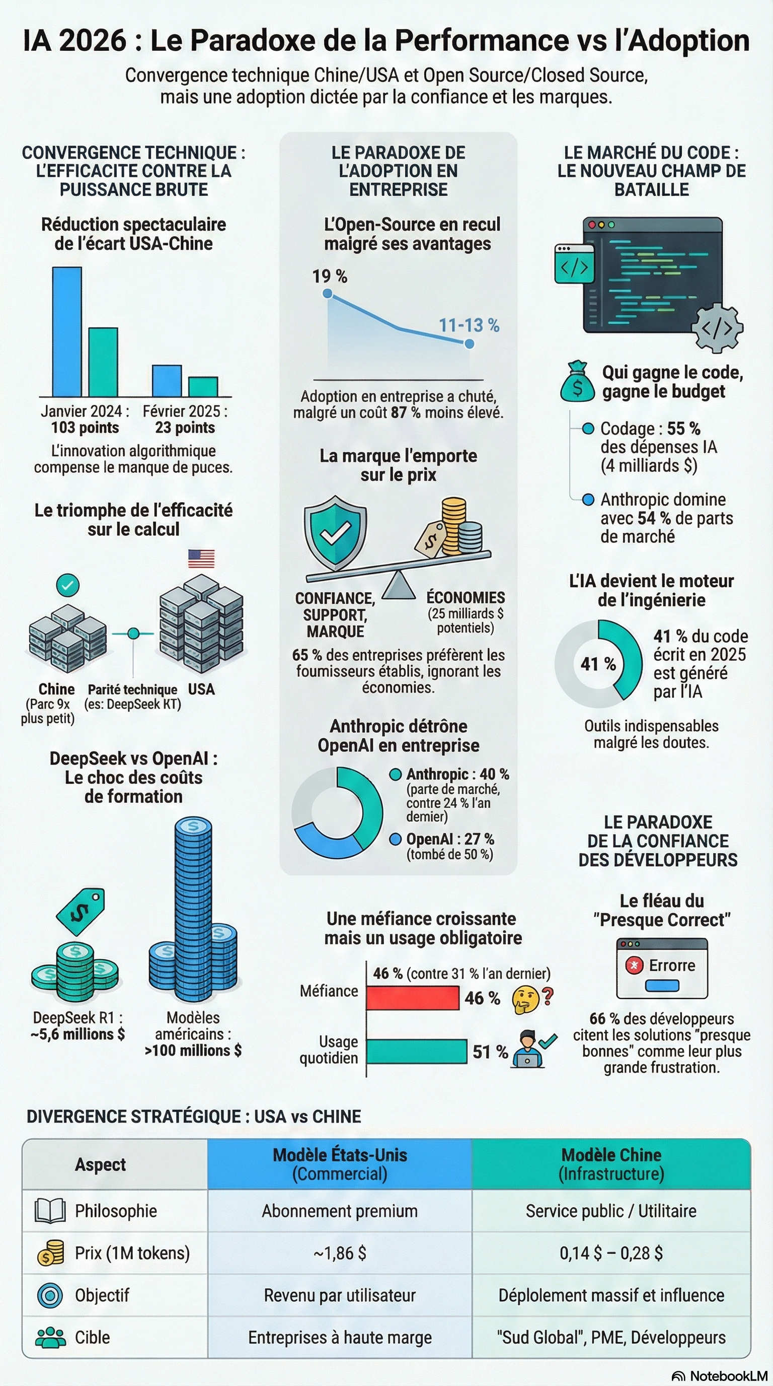 Pourtant, malgré une quasi-parité et des prix défiant toute concurrence, une fracture s'est creusée entre juillet 2025 et aujourd'hui. Pourquoi, alors que l'IA devient "parfaite" et 87 % moins chère, la méfiance des développeurs explose-t-elle et les entreprises se réfugient-elles derrière des jardins fermés ? La réponse ne se trouve pas dans les benchmarks, mais dans une mutation profonde de la confiance et de la géopolitique.