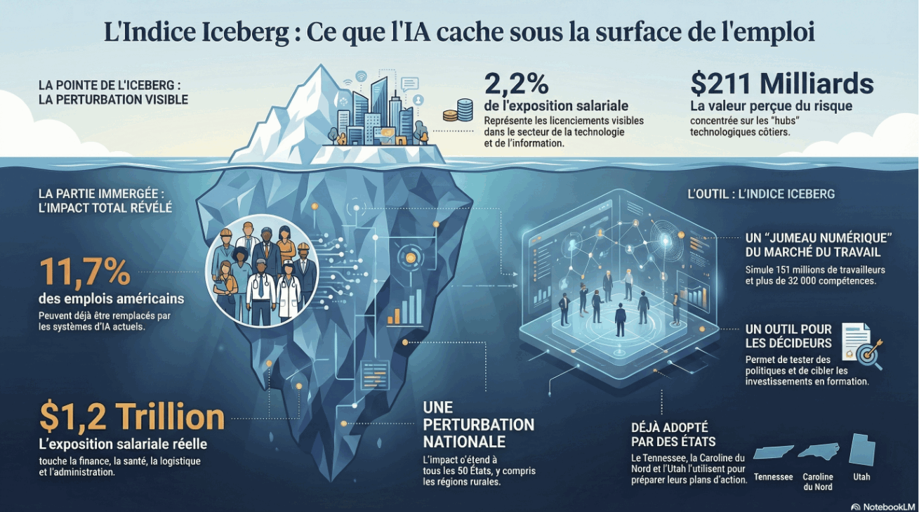 L'étude utilise une métaphore puissante pour illustrer sa découverte principale : l'« Indice Iceberg ». La "pointe visible de l'iceberg" correspond aux licenciements et aux changements de postes très médiatisés dans le secteur de la technologie. Cependant, ces perturbations ne représentent que 2,2 % de l'exposition salariale totale, soit environ 211 milliards de dollars.