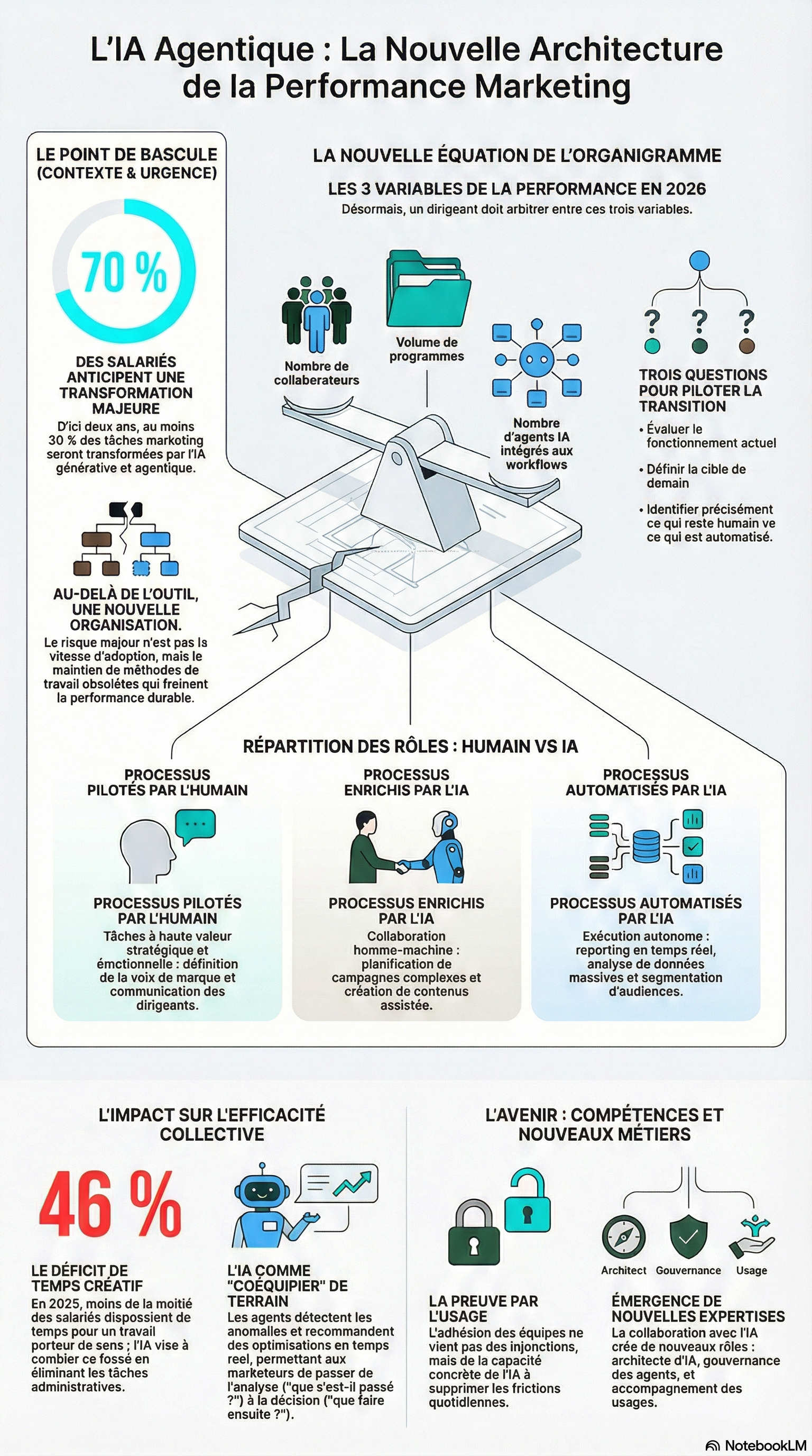 L'innovation apportée par l'IA est une opportunité historique de redonner au marketing ses lettres de noblesse stratégiques. La technologie est mature, les gains de productivité sont prouvés, et la mutation des métiers est amorcée. Une question demeure pour chaque décideur : votre prochain recrutement sera-t-il un humain de plus pour compenser l'inefficacité du système, ou l'architecte de vos futurs coéquipiers digitaux ?