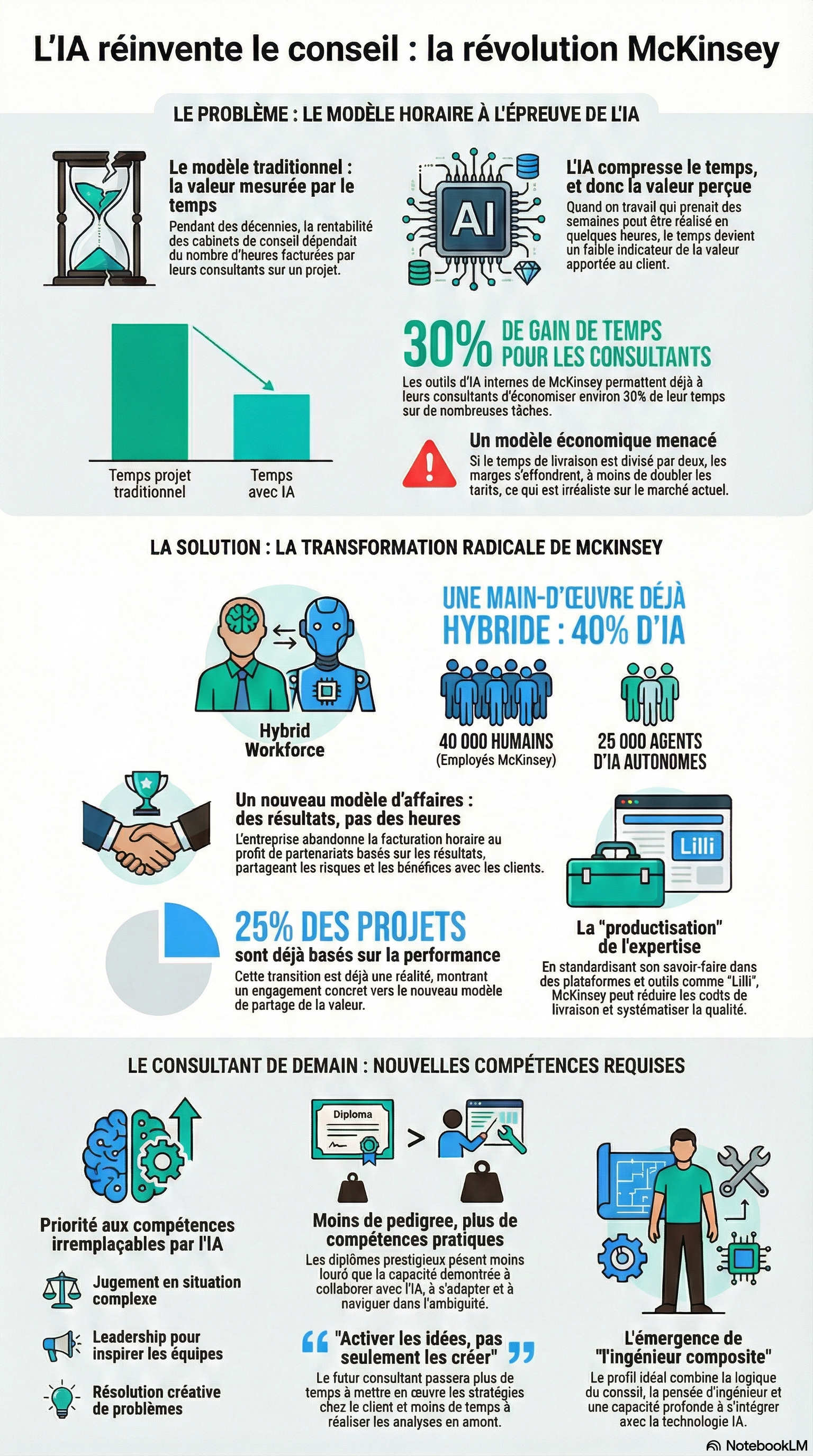 Pendant des décennies, le modèle économique du conseil a reposé sur un pilier : l'heure facturable ("billable hour"). La valeur était directement corrélée au temps passé par des consultants sur un projet. L'IA pulvérise cette logique en compressant radicalement le temps nécessaire pour produire des analyses et des recherches. Les outils d'IA internes de McKinsey permettent déjà à ses consultants d'économiser environ 30 % de leur temps, ce qui n'est pas un gain marginal mais un changement structurel.
