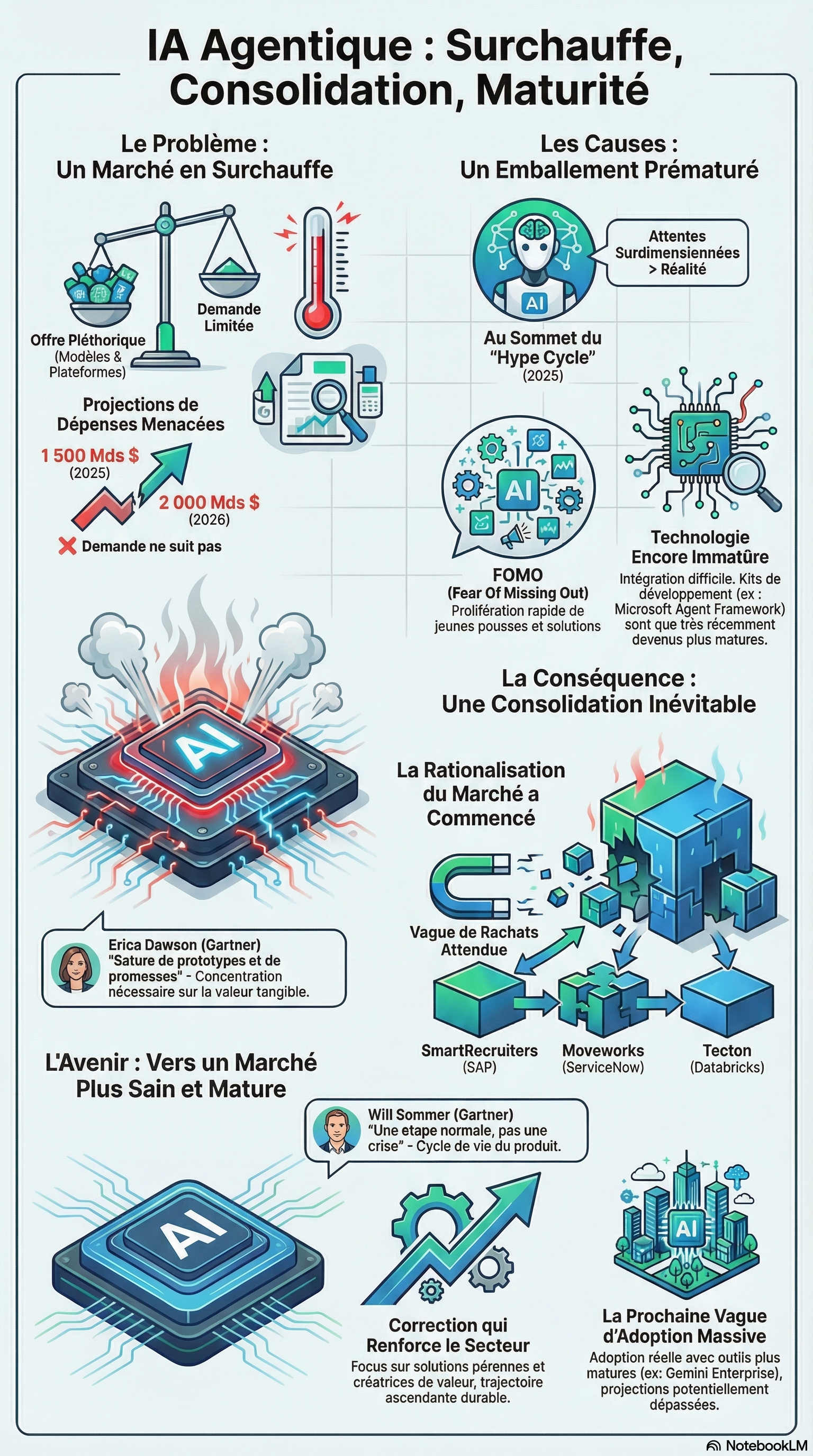 Le marché de l'IA agentique est en train de pivoter. Il quitte une phase d'euphorie et de promesses démesurées pour entrer dans une ère de maturité stratégique, où la recherche de valeur tangible devient la priorité. Cette correction ne fait pas que sécuriser la trajectoire à long terme de l'IA agentique : elle la renforce, en créant les conditions pour potentiellement surperformer les projections actuelles. La correction actuelle du marché est-elle donc l'étape nécessaire pour que les entreprises puissent enfin enclencher une nouvelle vague d'adoption massive des agents intelligents ?