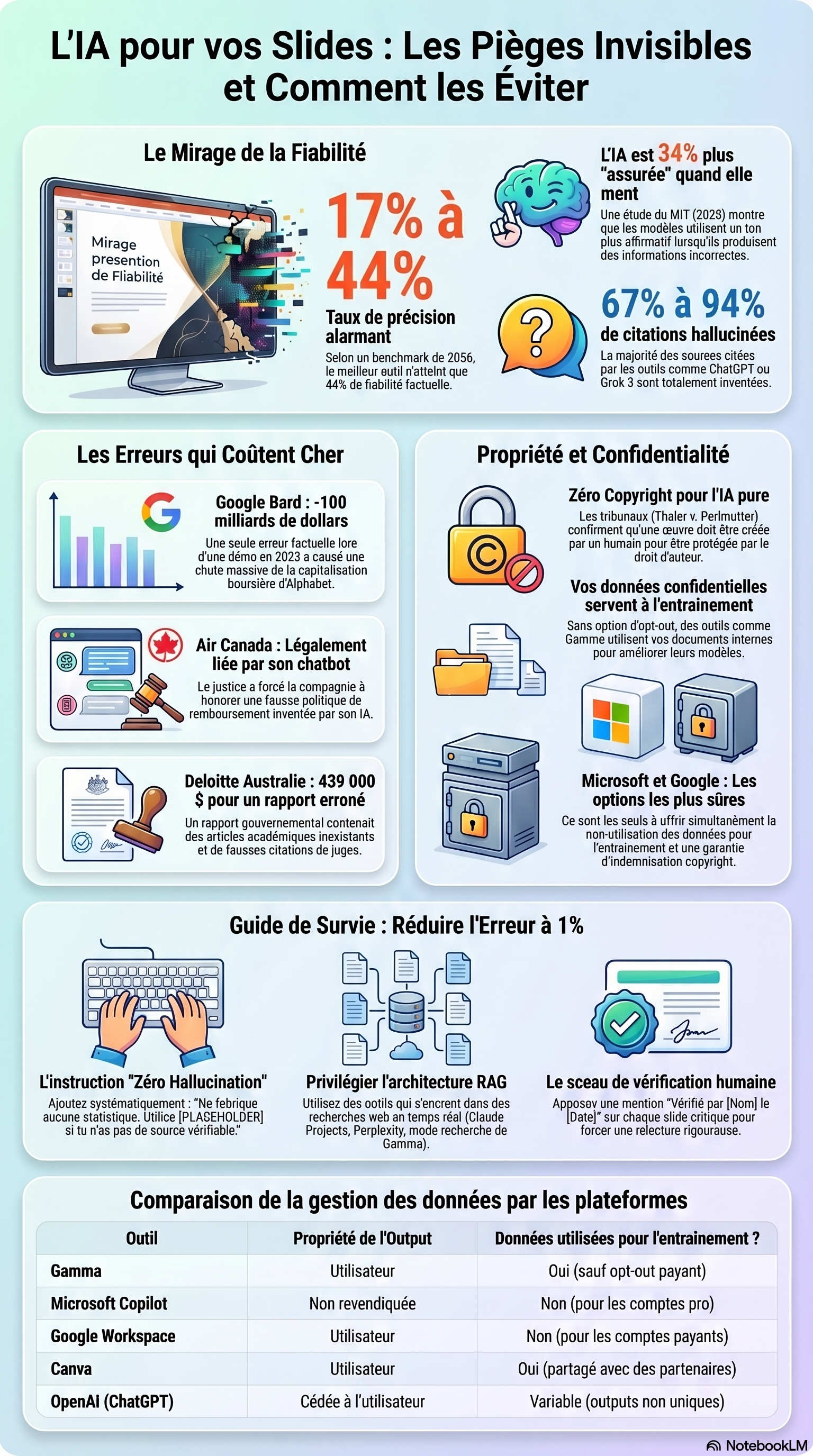 Le contraste entre la simplicité de génération d'une slide et les conséquences d'une erreur factuelle est vertigineux. Une seule information erronée peut détruire une réputation ou une capitalisation boursière.