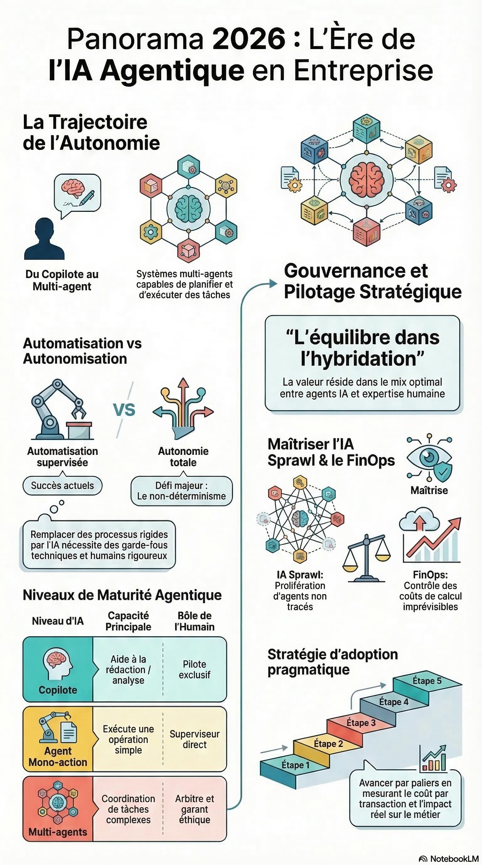 L'horizon 2026 ne verra pas l'émergence d'entreprises « 100 % IA ». La trajectoire réaliste est celle de l'organisation hybride : capable d'automatiser massivement ce qui est rentable et prévisible, tout en maintenant l'intelligence humaine sur les points de contrôle et de décision stratégiques.