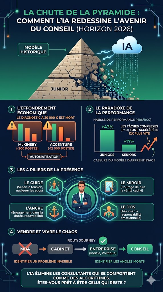Le diagnostic facturé au poids est mort. La pyramide traditionnelle vacille. Mais l'opportunité est immense pour ceux qui acceptent de quitter le confort de l'analyse pour la prise de risque de la présence.
