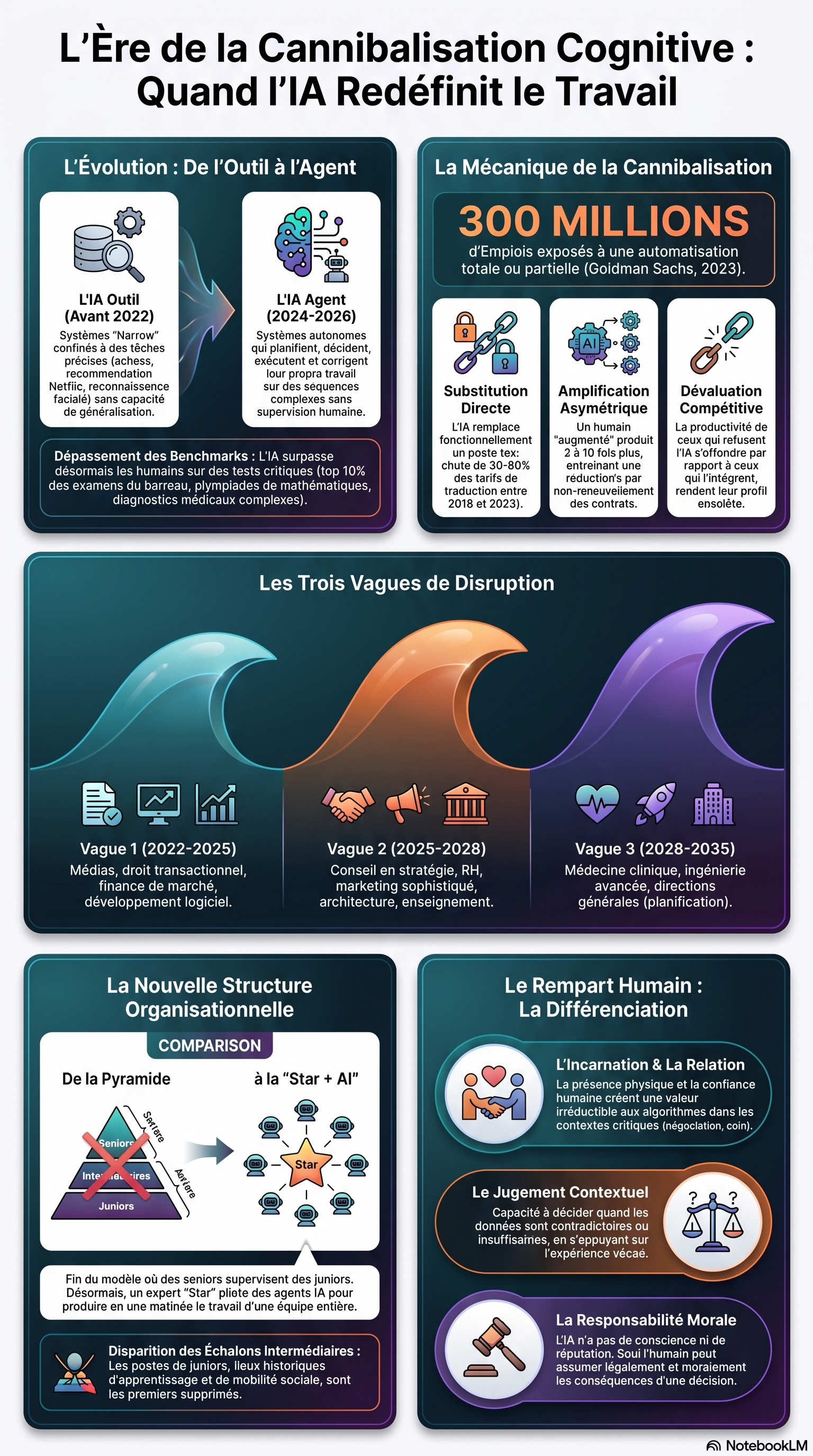 Amplification Asymétrique : Le risque le plus dévastateur. Un humain "augmenté" produit 3 à 10 fois plus qu'auparavant. En conséquence, une organisation peut maintenir sa production avec une fraction de ses effectifs. La réduction est structurelle, masquée par des gels de recrutement plutôt que des plans sociaux.