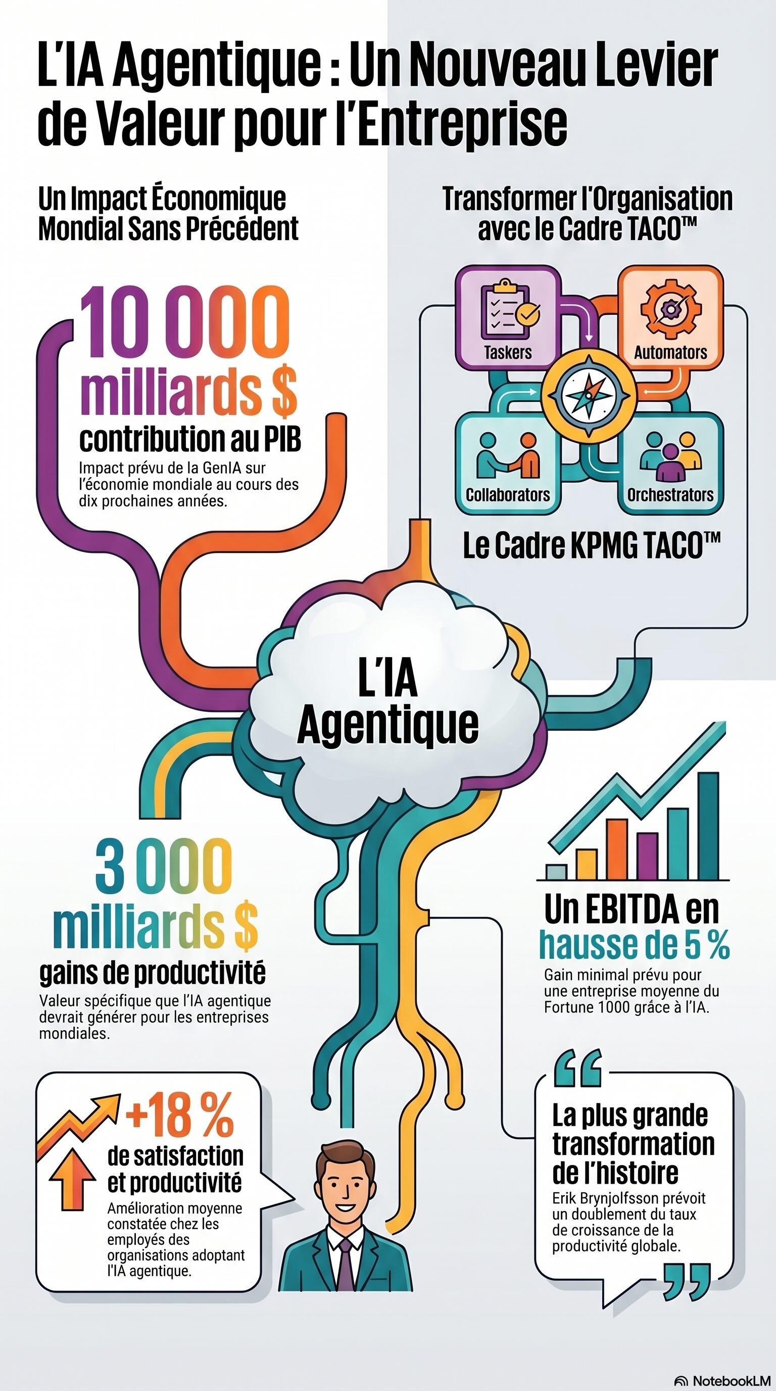 L'IA agentique marque la fin de l'IA de démonstration et le début de l'IA d'exécution. Entre la promesse d'une productivité doublée, un apport massif de 3 000 milliards de dollars à l'économie et la structuration des rôles via le modèle TACO, les fondations de l'entreprise de la prochaine décennie sont déjà posées.